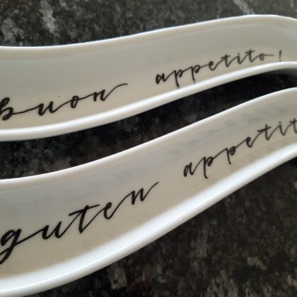 "On mange aussi avec les yeux". C'est pourquoi, je propose des plats écrits à la main pour rendre le moment inoubliable - que ce soit pour la fête d'anniversaire de grand-maman, l'apéritif entre amis ou le marathon de séries-TV confortable à la maison. Après tout, il faut célébrer chaque évènement à mesure qu'ils arrivent. Et voilà - lorsqu'on grignote avec ses proches, petit à petit une pensée se révèle sur la porcelaine.